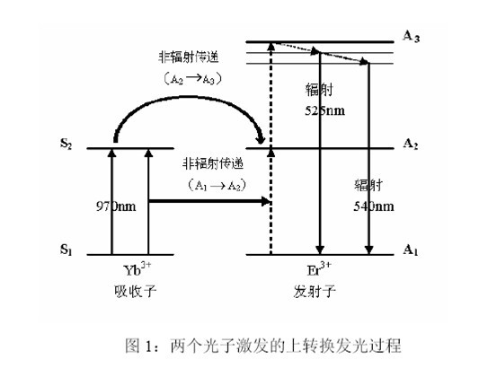 自然界中存在很多有機或無機物質,它們可以在電磁輻射激發(fā)下發(fā)射熒光或磷光,且在發(fā)光過程中遵守Stokes 規(guī)則,即發(fā)射光的波長長于激發(fā)光的波長。而在20 世紀70 年代,科學家們卻合成了一類可以反Stokes 規(guī)則產生磷光的特殊材料,即UCPUCP 在紅外光區(qū)(波長>780nm)被激發(fā),卻可以發(fā)射波長遠短于激發(fā)光的可見光(波長475nm-670nm),即能量上轉換。物質構成決定性質特點。UCP 是由稀土金屬元素摻雜于晶體的晶格中構成的。在這種材料中有三種主要的成分:主基質(Host Matrix)、吸收子(Absorber)和發(fā)射子(Emitter)。作為主基質的晶體材料有:氧硫化物(如Y2O2S、GdO2SLa2O2S 等)、氟化物(如YF3GdF3、LaF3 等)、鎵酸鹽(如YGaO3Y3Ga5O12 等)以及硅酸鹽(如YSi2O5、YSi3O7 等)等;常用作吸收子的稀土金屬離子有:鐿離子(Yb3+)、鉺離子(Er3+)、釤離子(Sm3+)等;常用作發(fā)射子的稀土金屬離子有:鉺離子(Er3+)、鈥離子(Ho3+)、銩離子(Tm3+)、鋱離子(Tb3+)等。吸收子和發(fā)射子這一離子對在主基質晶格內適宜的空間取向和距離,是產生上轉換發(fā)光的基礎。上轉換發(fā)光的產生是一個涉及多個(至少兩個)光子的光學過程。在這個過程中(如圖1),UCP 內的吸收子(如Yb3+)至少要吸收兩個低能量光子(紅外光區(qū),970nm),而后經過一系列內部能量轉換,以非輻射的形式(A1A2,A2A3)將這兩個光子的能量連續(xù)傳遞給發(fā)射子(如Er3+),以使其處于激發(fā)態(tài)(A3)。后者接著發(fā)生一個返回基態(tài)能級的躍遷,釋放一個高能光子(可見光區(qū),如525nm 540nm),完成能量上轉換。